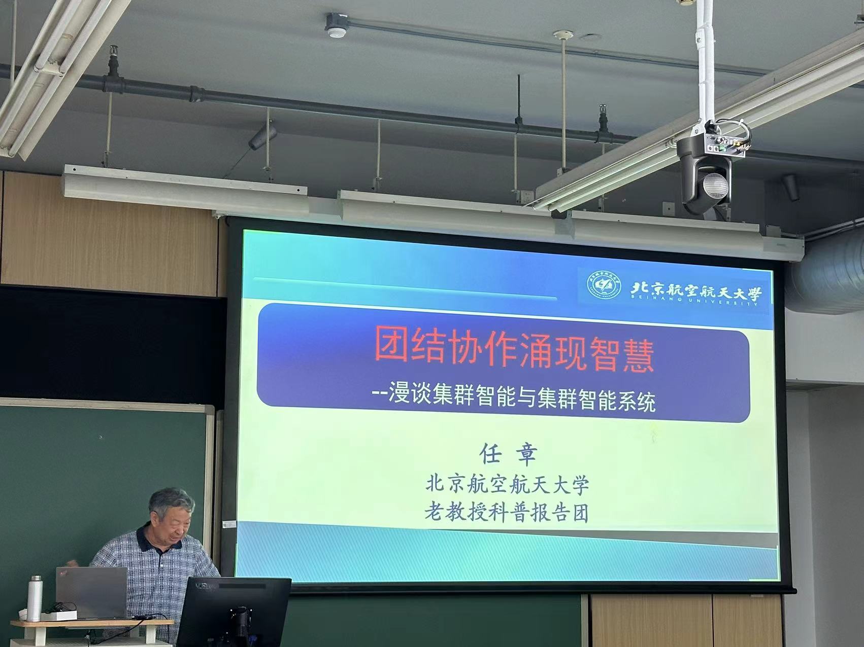 随后任章教授针对集群智能和集群智能系统做了更加详细的介绍,解释了集群行为、特征以及我们有关生物集群需要研究什么。而针对集群中个体的相关行动要求和原则,叙述了邻近原则、稳定性原则和适应性原则等,让大家明白了集群的规律和常见规律。针对集群智能研究和发展趋势,任章教授从集群智能的研究起源开始讲起,到我们现在的人工智能研究阶段,再到网络化系统研究阶段以及后续发展,任章教授都结合自己的理解和实例向大家进行了清晰的阐述,让大家理解了目前这项技术的发展实质。针对集群智能的运用实例,任章教授以无人机蜂群在各项任务中的效果对大家进行说明,同时结合国家对新一代人工智能发展的规划以及中美目前的研究方向给出了自己的理解。最后任章教授向大家说明了现在我们国家在某些研究方向上的不足,呼吁大家团结协作、攻坚克难、迎头赶上,为祖国贡献自己的一份力量!