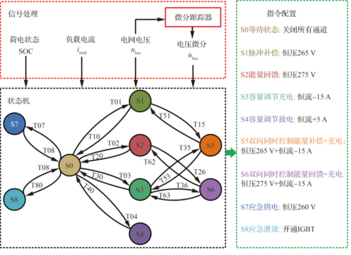 本文提出了一种基于电网电压-负载电流和蓄电池荷电状态的综合能量管理策略,采用基于微分跟踪方法的多模式状态机实现系统负载扰动的快速检测和供电模式的快速配置。通过仿真验证了状态转移逻辑的准确性,以及所提出脉冲补偿、能量回馈吸收、储能容量调节和应急泄放功能的有效性。本文还引入了微分跟踪器与负载电流前馈相结合的稳压控制算法,显著提高了系统在全负载范围内的动态响应速度和稳压精度。