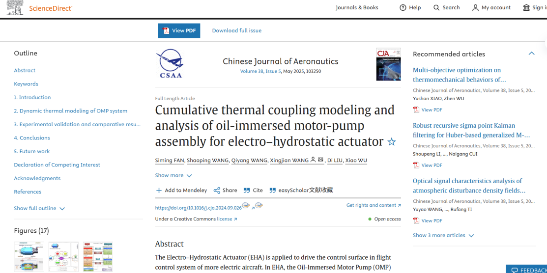 日前,beat365官网王少萍教授团队在《Chinese Journal of Aeronautics》期刊发表了《Cumulative thermal coupling modeling and analysis of oil-immersed motor-pump assembly for electro–hydrostatic actuator》研究论文。该项研究针对油浸式电静液作动器(Oil-Immersed Electro-Hydrostatic Actuator, OI-EHA)在高集成、高功率密度工作条件下的热管理挑战,提出了新型的闭环迭代动态热耦合建模方法,揭示了多物理场热交互及其对系统性能的动态影响机制。论文由樊思明、王少萍、王启扬、王兴坚、刘迪、吴潇共同完成,王少萍教授为团队带头人,王兴坚教授为通信作者。