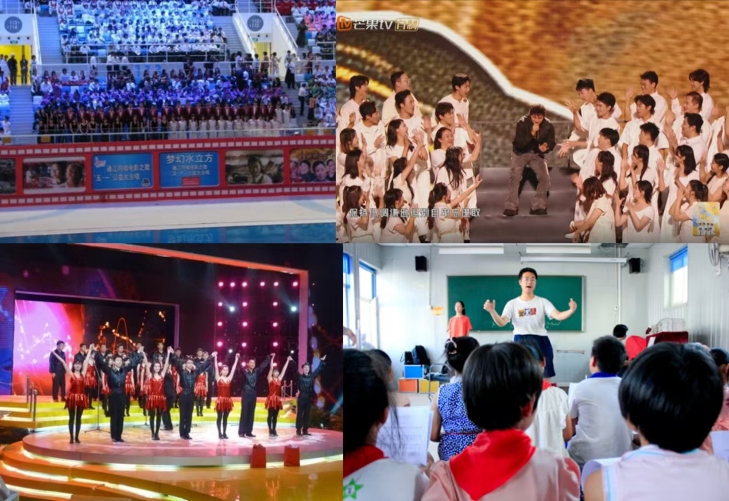 飞天艺术团主动走出校园,将“飞天”美育品牌与思政理念传递到更广阔的舞台:在梦幻水立方通江同唱电影之歌“五一”公益合唱活动中,团员们以《劳动托起中国梦》等歌曲传递劳动精神,用艺术凝聚时代力量,吸引现场观众超5000人;走进沙河于辛庄小学开展“艺术点亮童心”合唱支教,通过“空天知识小课堂+合唱排练”的形式,将艺术之美与“空天报国”的种子播撒在孩童心中,惠及小学生200余人次;在798艺术中心开展“青春向祖国告白”公益快闪活动,以《我和我的祖国》等歌曲传递青春正能量,让美育成果服务社会;排演《永不消逝的电波》等红色剧目,以艺术实践厚植思政底色。系列活动既提升了团员的艺术实践能力,更扩大了“飞天”品牌的社会影响力,让北航“空天报国”精神通过艺术形式走向更广阔的舞台。