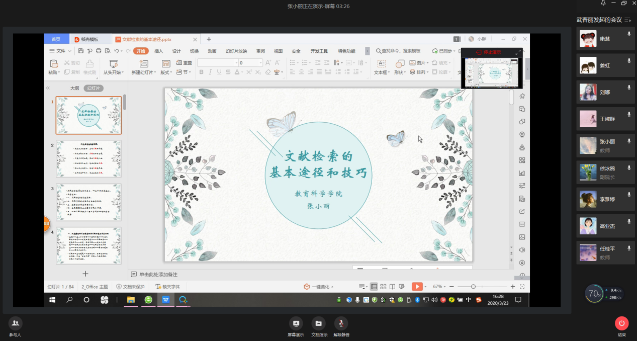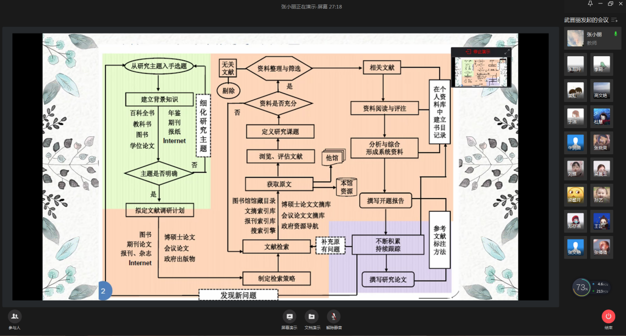 在新冠肺炎疫情防控的特殊时期,为更好培养金沙老品牌官网研究生的学术规范意识,扎实学术研究基础,提升学术研究能力,学院研究生教学工作领导小组于2020年3月23日下午,特邀金沙老品牌官网副教授张小丽老师为全院教育类的硕士研究生做了关于“文献检索的基本途径和技巧”的线上专题讲座,金沙老品牌官网部分教师旁听了讲座(师生共计280人)。