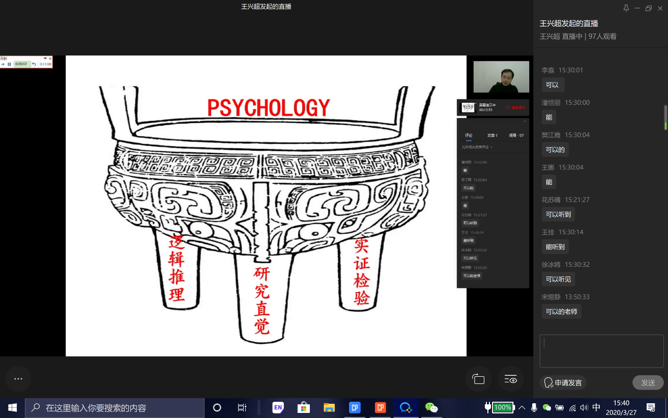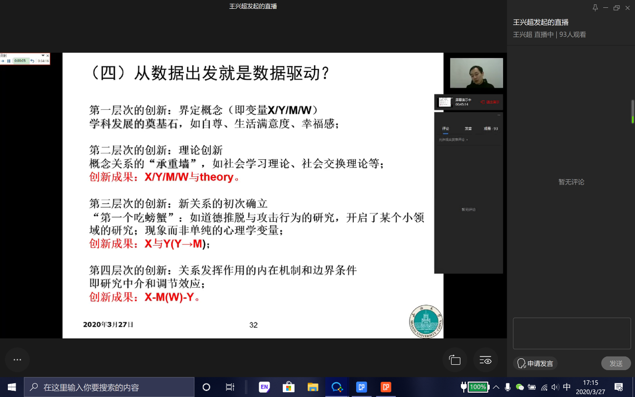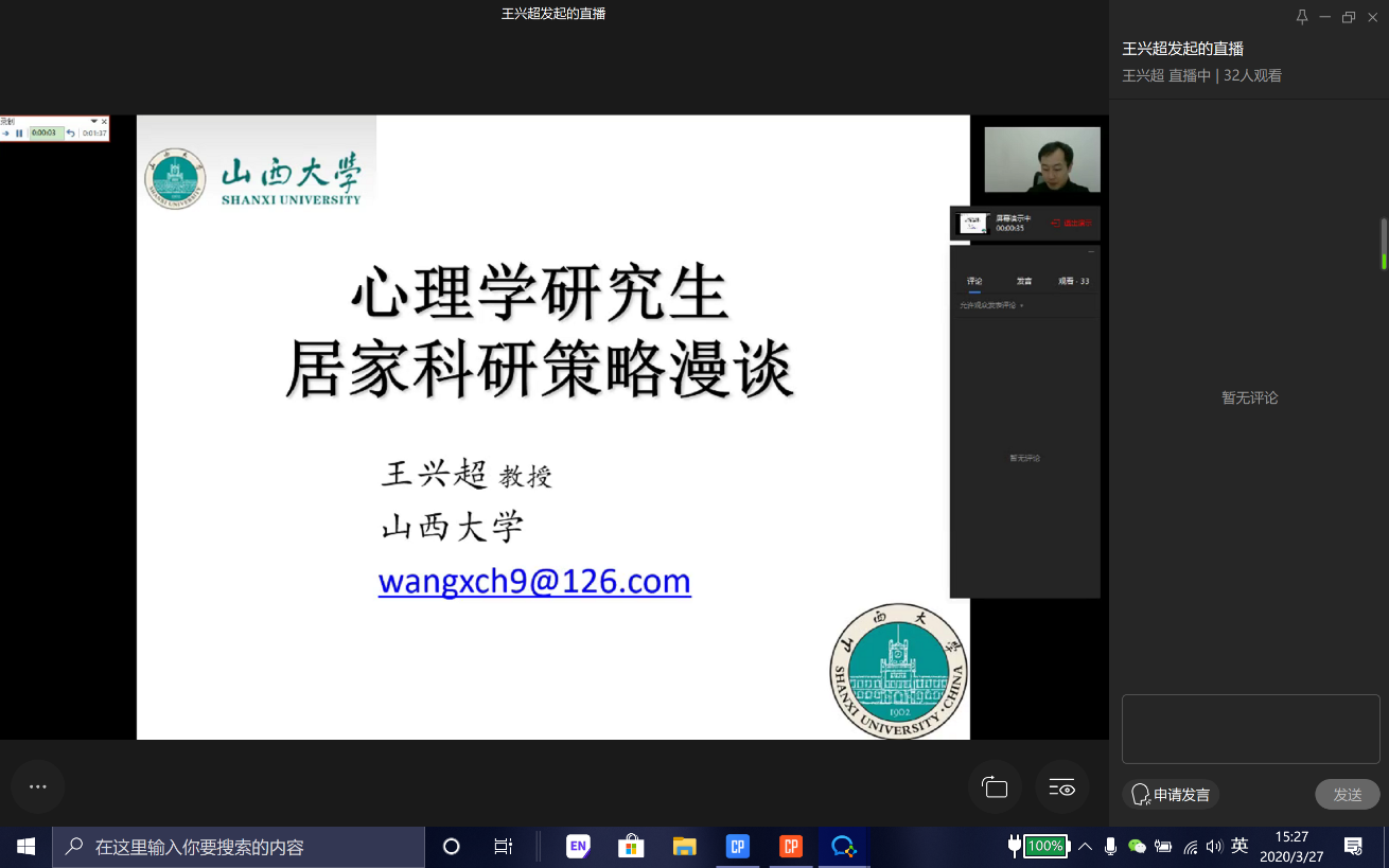 在疫情防控的特殊时期,为了贯彻教育部“停课不停学”的指导精神,更好的培养金沙老品牌官网研究生的自主学习和科研能力,学院研究生工作领导小组特邀心理学系王兴超教授于3月27日下午在线上举办了“心理学专业研究生居家科研策略漫谈”专题讲座。副院长徐冰鸥教授、部分老师及心理学专业在读研究生共计90余人参加了本次讲座。