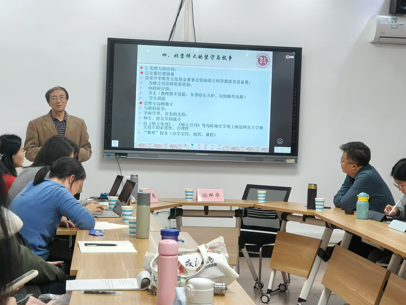 孙教授从“高师何以改大”“高师改大两种模式”“高师改大后之危局”“北京师大的坚守与抗争”四个方面展开讲解。首先,孙教授结合1922年学制改革阐述了高师改大的背景。孙教授指出,学制改革对中学师资提出新的要求,当时教育界在有关中学师资培养上有三派意见,高师改大即为其一。其次,孙教授考察了原教育部直属七所高师的具体改设情形。孙教授指出,高师改大出现了“北京高等师范学校—北京师范大学”与“南京高等师范学校—东南大学”两种模式,至30年代初,北京师范大学成为“硕果仅存”的师范大学。接着,孙教授分别阐述了“改大”之后北京师范大学遭遇的各种危机与应对之策。孙教授指出,20年代至40年代,北京师范大学不断遭遇经费困难、校长相继辞职、暂停招生、停办、“抗战胜利”后不能复员等危机。北京师范大学师生、校友在极度困难的情况下,进行坚守、抗争,维护了师范大学独立设置的体制,为中国高等师范教育保存了发展的火种。最后,孙教授对高师改大运动作了深入的总结与反思。